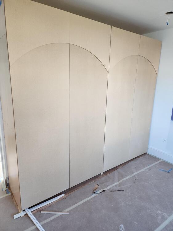 9. And for something a little more positive... The cabinets arrived for the smallish remodel I'm currently working on. Got the kitchen and office cabinetry installed Monday and Tuesday. Was installing two tall Armour cabinets in the bedroom. The client came by this morning, looked at the installation and complimented me on a job well done. But she happened to mention that she was disappointed that the cabinet maker couldn't fulfill the designers request regarding some detail ordered. I wasn't aware of this and asked her about those details. She pulled up a pic and showed me... Basically it's just the arches added to the doors. I asked why he couldn't accommodate that design detail, to which she replied that he told her he didn't have a CNC machine. I explained that if that detail was important to her, I could create that and didn't need a stinking CNC to do so. She brightened up a bit, I called the boss, filled him in, and he told me to go for it and make the client happy.