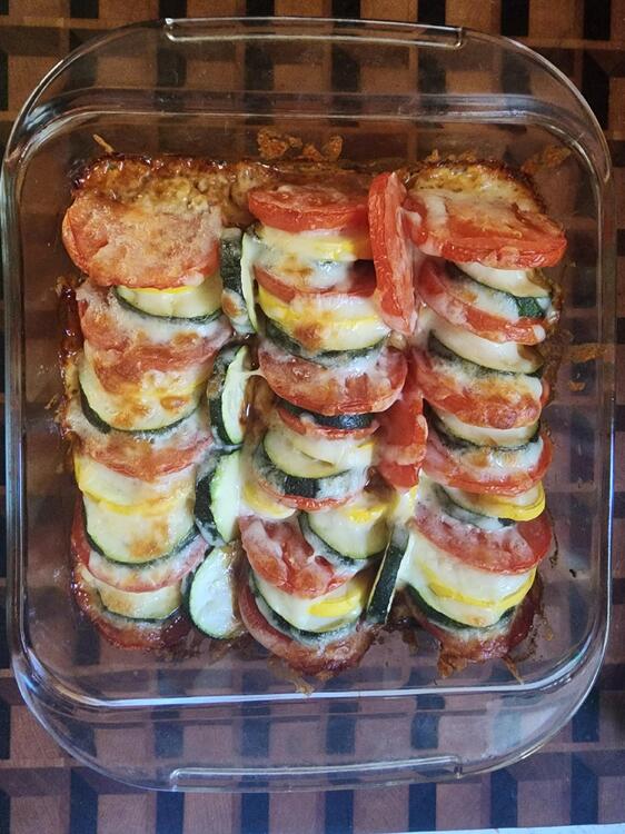 The layer of caramelized onions underneath the zucchini, summer squash and tomatoes is kind of the surprise of this dish. Can't wait to tuck in, but it's lava hot ATM.