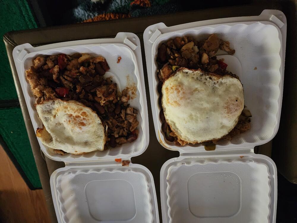 Fried chicken hash from Hummingbird. The thing is, I only ordered one. When I arrived to pick it up, they charged me for one. Then handed me a big, folded paper bag. I didn't realize it was two orders until I arrived home. So I guess I have breakfast for tomorrow as well.