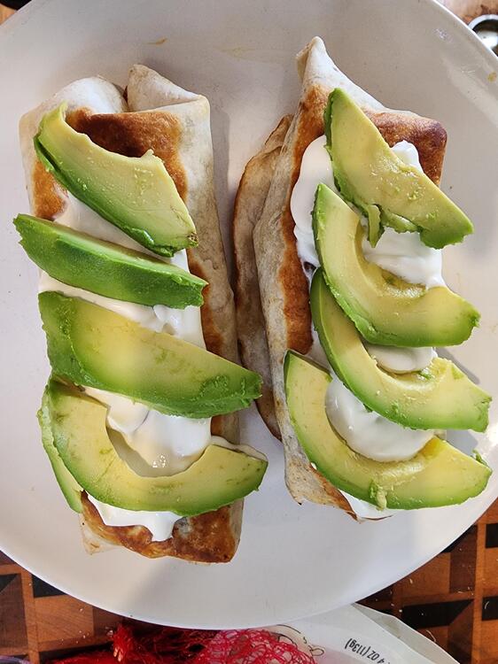 My neighbor Dave's wife is out of town, so I'm making and taking up batchelor burritos. Seasoned beef, refried beans, peppers, onion, tomatoes, cheese, sour cream and avocado. Batchelor chimichangas actually.