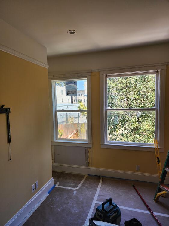 Taking away a balcony door on the top floor rental of a home in the Sunset District. Replacing old door with a window. My boss is a stickler for matching the height to the existing window, down to the 1/16". That's the hardest part, especially since the existing window is nothing like the new one. Turned out great. Once the painter is done it'll look like it's always been that way.