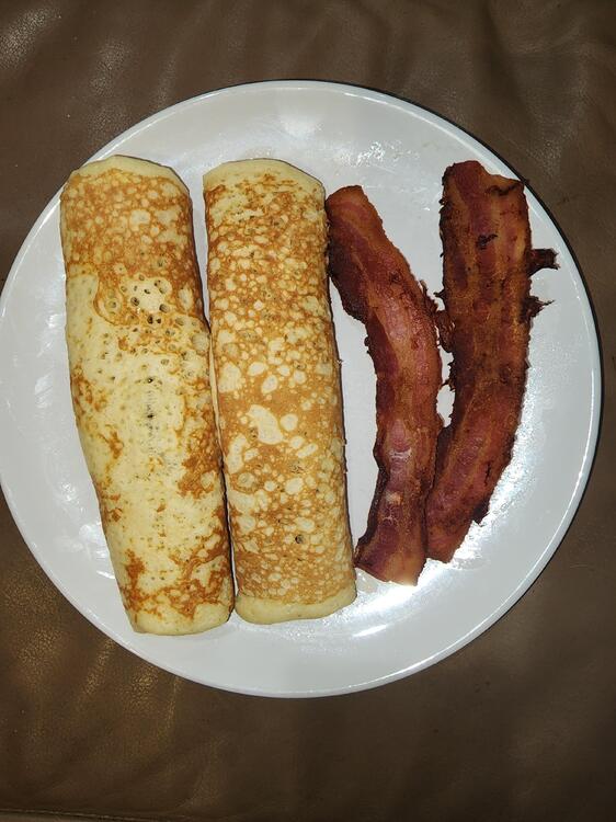 Today's breakfast menu: Fig filled pan-crepes (hybrid) with Orange zest and a side of bacon. Coffee w/ Irish Cream Liqueur.
