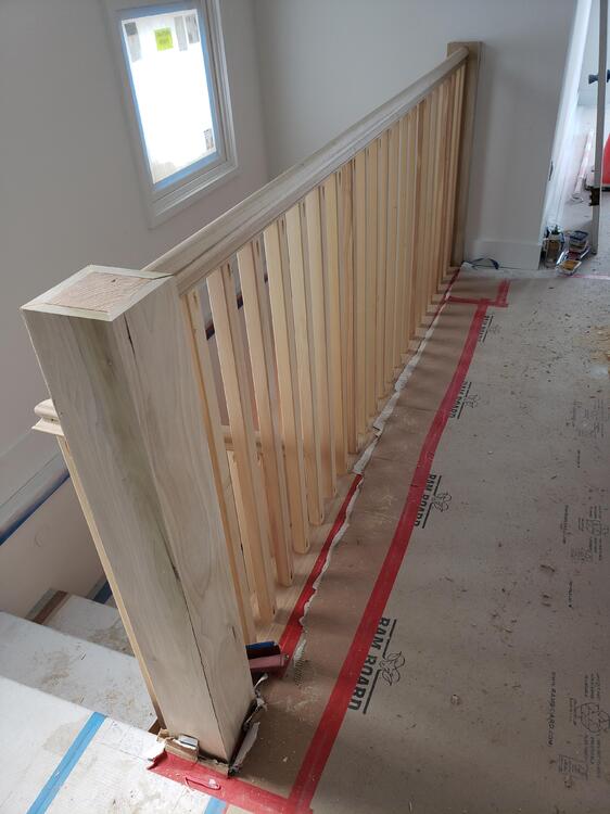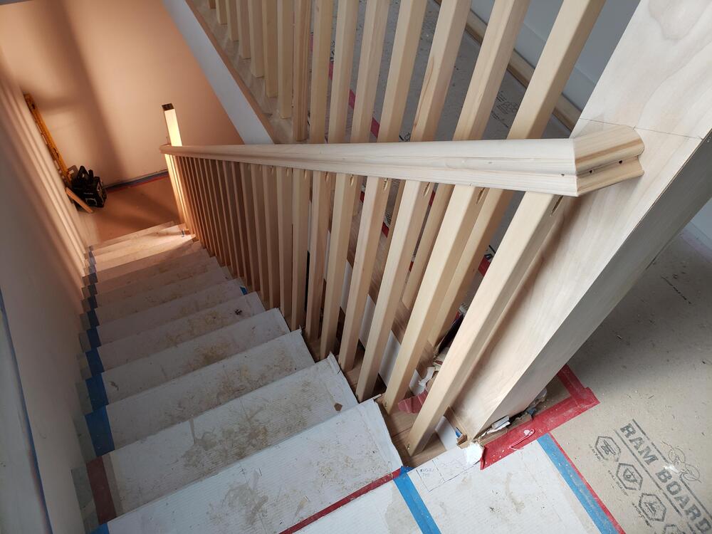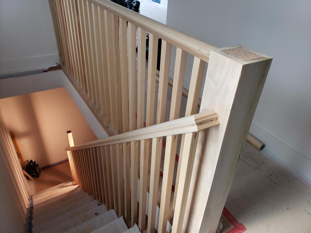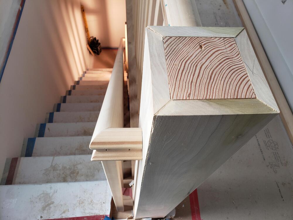 I meant to post this last week when I actually built it, but forgot to. I also forgot to take finished pictures with the newel caps in place, but use your imagination. A couple of weeks ago one of the bosses told me that he forgot to call the stair guy to build railings at the new addition of a smallish job. By the time he remembered, the stair guys schedule was too far out to meet our deadline. The railings needed to mimick the existing railings of the San Francisco Victorian home. He asked me if it was something I thought that I could do. Stairs and railings are usually a specialty, and as such are usually subbed out. A sub genre of finish carpentry, if you will. I haven't actually built indoor railings before, but I knew it was something that I could accomplish. There were no solid newel posts available in the size that I needed, so I built my own. As these will be painted, I used Poplar. It's a good, stable wood that doesn't have the most beautiful color or grain pattern, but is easy to mill and takes paint very well. The exception are the pickets, which are Alaskan Yellow Cedar. Kind of felt right using a wood from my home state. It's not soft like the usual Cedars, and has a very unique smell when cut. I got to use a lot of tradesman tricks and practices, and a lot of the math that I told my teachers I'd never need. Yes, they we're right. I did a lot of good preparation, so it wasn't just dumb luck, but it did fall together beautifully. The absence of a lower rail that the pickets sit on is a bit unique, but the existing rails pickets also connect directly to the stair treads. It actually works quite well at tying the newer, somewhat modern addition to the classic Victorian style. The caps not pictured are a pretty simple double cap design, with the bottom cap being 5/4 material, with a smaller top cap of 3/4.