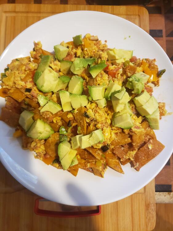 My landlord Dave's wife is in Hawaii, so the permanent and the temporary batchelors are having Migas for breakfast. Corn tortillas cut into strips and crisped in a bit of oil. Scallions and Orange bell pepper sauted with a little scorch. Tomatoes and avocado, chorizo and of course eggs.