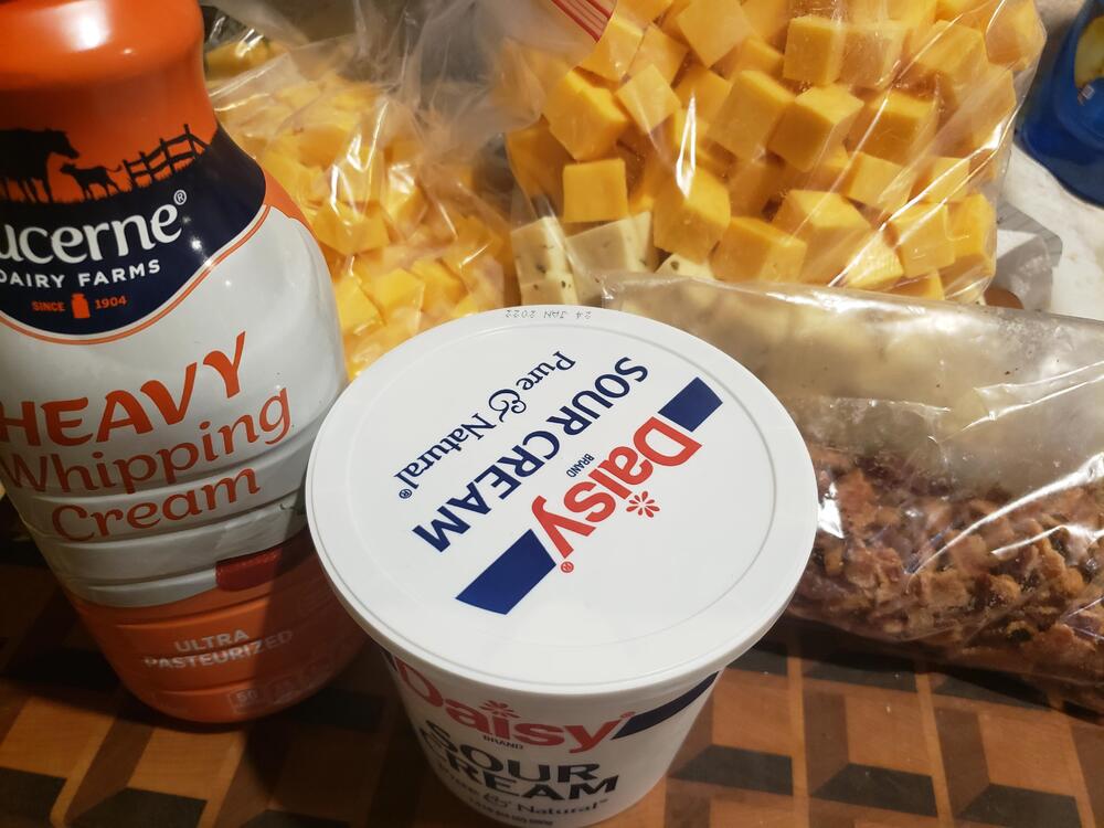 Just cooked 1.5 lbs. of bacon, then crumbled. Cubed 7 lbs. of cheese (5 lbs. Tillamook cheddar, 2 lbs. Boars Head pepper jack), in preparation for my homemade macaroni and cheese. My contribution to tomorrow's dinner at Al's Sister's house. If that sounds heavy to you, there's also 32 oz. of heavy cream and 24 oz. of sour cream involved in the cheese sauce. I generally make this dish only once a year these days. Not sure the arteries could take more than that.