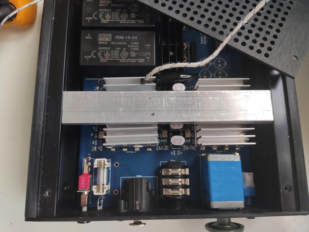 To the heat issue: I have a "standard" mini from the first group buys. Case, the unfortunate 3 oz board, 402 led resistor, 255 bias resistor, 15 mA bias. I used it with offboard regulators and without the top cover mainly for a time. Now I squeezed in the onboard regs second times a bit better with the same heatsinks but only with open lid. I would not like to reduce the bias so I experimented with @Skooby's resolution(see in this thread) a little. In my version there is almost 10 mm the distance from the transistors's heatsinks to the lid so I made a "heat bridge" from two 5 mm thick aluminium pieces as you see in the picture. The result is more than I hoped. Measuring the temp on the heatsink hotter side: with the top cover 85-86C; without the cover 70C. With the "heat bridge" and the cover 63C. The absolute temperature is depends on the ambient, the music, the headphones a bit but the more than 20C gain is stable. This was a surprise to me, the mod is easy maybe helps somebody. You can secure it with screws, widen it etc.. Maybe later. It is stabil mechanically I am happy with it as is. Thanks for Skooby! The temperatures were measured after cc. 90-120 minutes when they were stable.