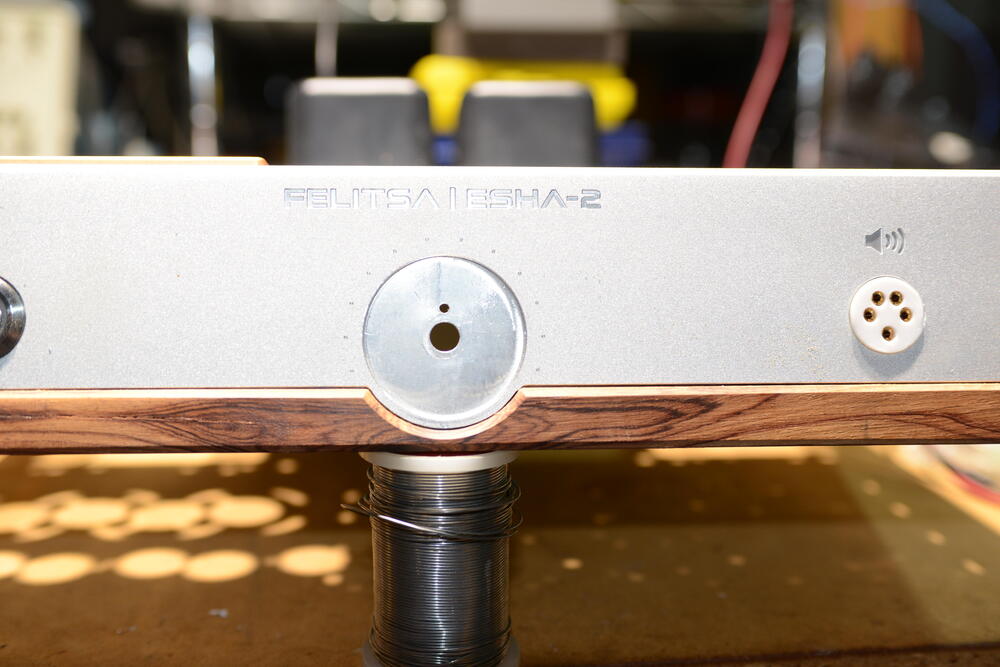So more than 30 minutes to disassemble the front panel, 10 minutes to get it aligned into my emco fb5, and 10 seconds to put in a fucking hole that should have been there from the start. Notice the fucked up stax jack and the shitty finishing on the wood. -