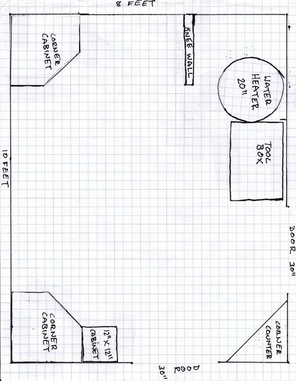 here's a drawing of what I have so far. The framer is going to start at the end of the month. After that I'll have the studs treated with borate. Next will be the electrical and network lines. Initially I was just going to use some off the shelf cabinets from the home depot, but my son works for a cabinet maker so I should be able to get some custom desk height cabinets made so I can have drawers. Any suggestions on the layout? The countertops will span the cabinets and the knee wall in front of the water heater. I'm thinking of using butcher block