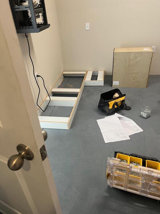 BIg update with pics tonight... They're installing the cabinets today! In the last year it was: Framed out Electrical and network were run insulated, drywalled, and painted Mini soho network rack installed and all business class devices installed. 2.5G wired and Wi-Fi 6e (3 hardwired ceiling pucks) My son got a job at a cabinet company of all places so he had them build the cabinets and match them to the ones that are throughout the new house (wife insisted). I can finally start working on projects again after a 2 year hiatus! My first order of business is building a DAC, I sold mine and am down to a chord mojo.
