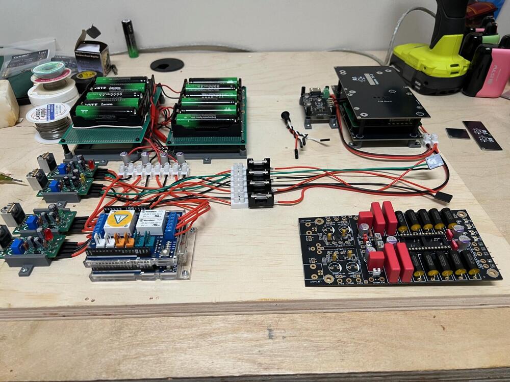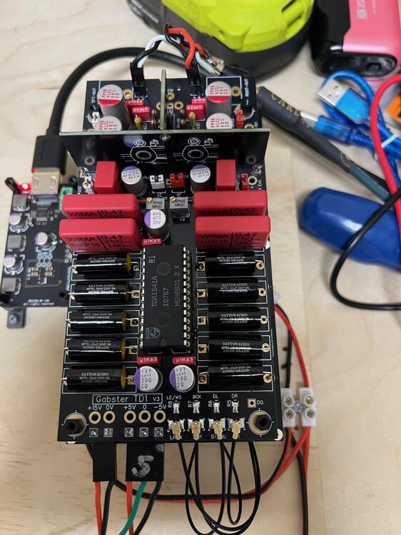 The first completed DIY project in 3 years and in my new workshop lives! It's a battery powered Philips TDA1541A based stereo DAC, About 18 months ago I needed something to kick start me back into DIY after breaking down my old setup and moving to Florida. So I built a 10'x11' room in one of the garage bays and proceeded to slowly unpack. I ran across a few threads about the TDA1541 and became curious. This is what I settled on for the first try. It's on a test board I put together so I could mess with different power supplies and experiment with controlling relays to turn the power on and off. It's sounds surprisingly good! Very easy to listen to, the vocals are up front and full of details. It's only been running for about an hour so the highs are a little bright but we'll see what happens after a few days. I'm also feeding it an I2S signal from a PCIE to I2S bridge that's running off the switcher in the PC so I'm hoping a better PSU for the bridge will add further improvements. I have what I need for a balanced setup and then two chips paralleled in a balanced config so that along with a display for the Arduino are coming. Let the flames begin!