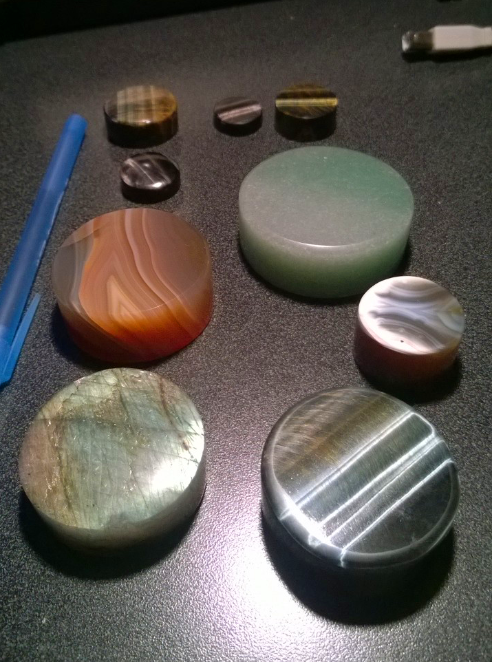Here are several new knobs that were recently made for my stock, for use in various projects. Material: blue tiger-eye, labradorite, aventurine, agate. The aventurine one will be softly backlit as a pilot lamp. Opalized petrified wood knob under fabrication now....