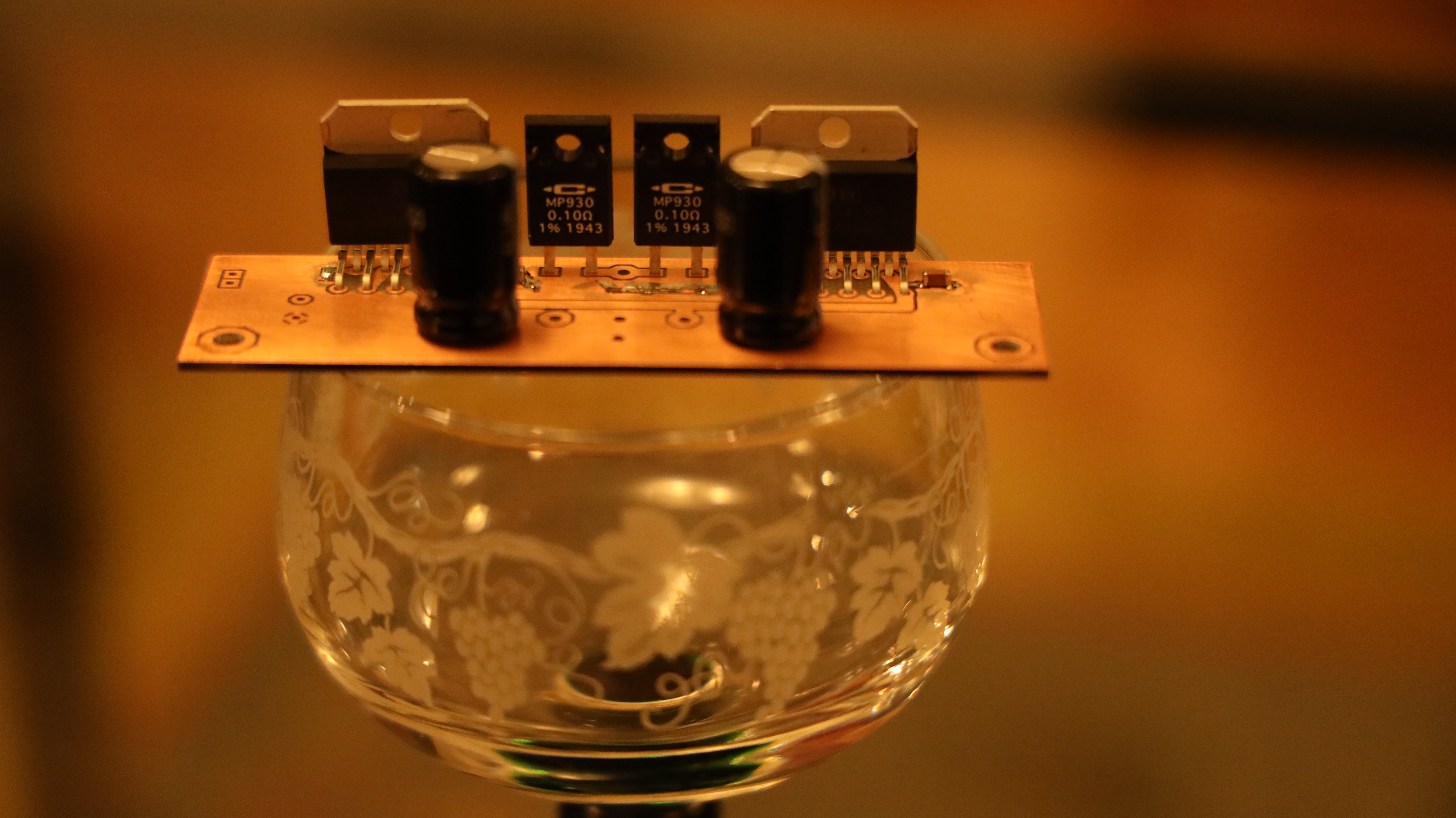 Milling process went smooth. Here is the board populated with components I had at hand and it works alright I would say. It is playing in pair with a Carbon I built three years ago. The Carbon to the left but its actually the right channel. Amplifier is upside down. I put the trimmer on bottom side – I forgot that this isn’t a tube amplifier with none component side facing upwards. In schematic posted earlier there is a couple of 2SA1486 but I took a pair of KSA1156 instead which is OK as HV is +/-400V.