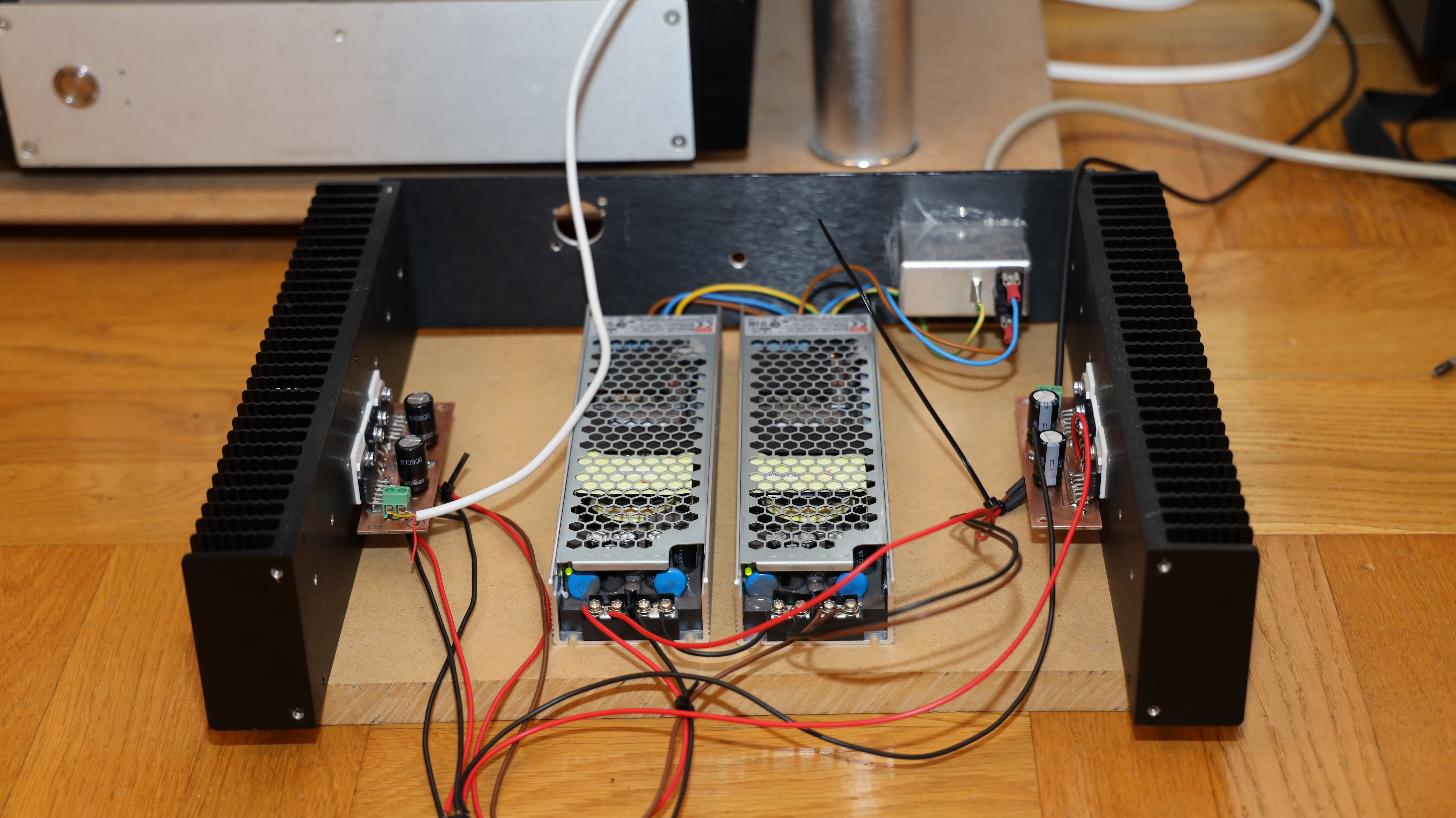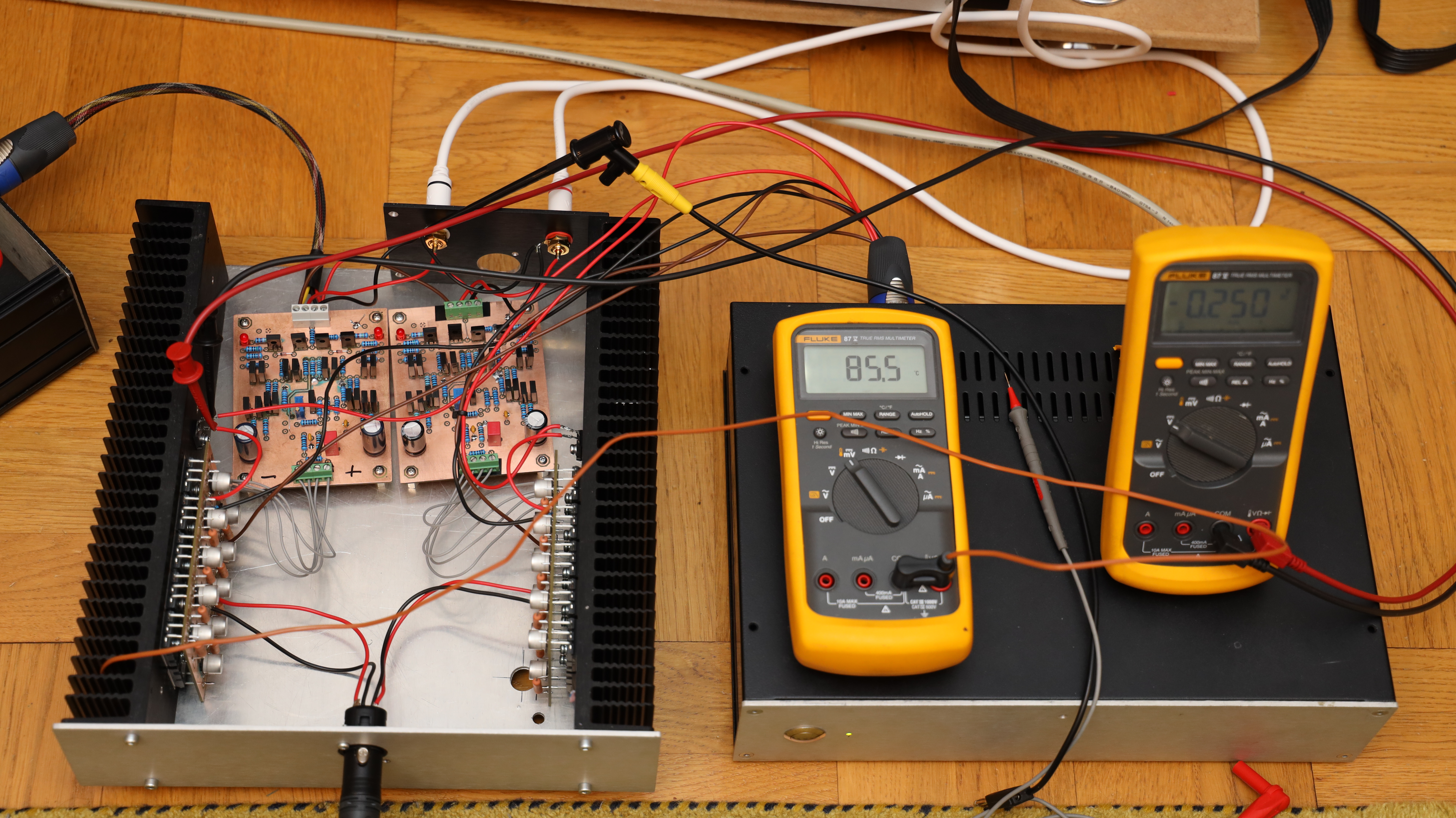 Schematic a few posts up is updated and now reflects what I’ve built. Changes: R21 – R23 and Q3,Q4. Picture from top. Carbon board to the right with ceramic insulators. New thing to the left. All transistors (2SA1968 and 2SA4686) on bracket are insulated and don’t need ceramic insulators.