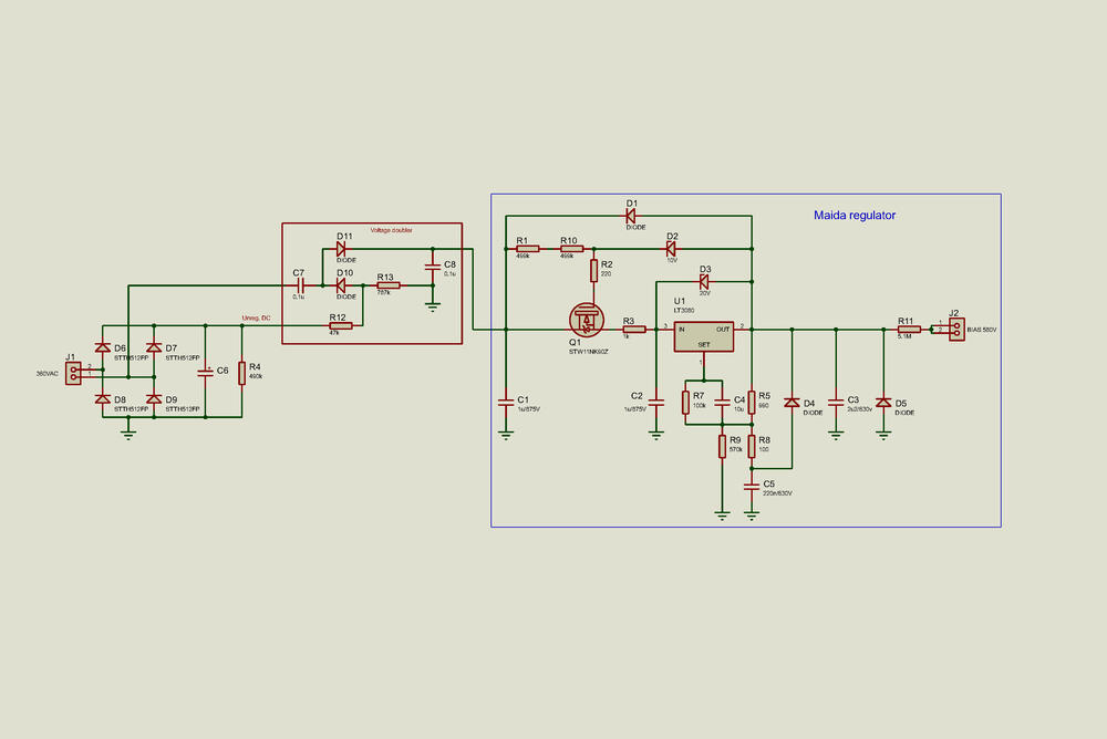 Draft of BIAS 580V regulator. Works in LTspice. After the voltage doubler is a Maida regulator. Q1 is a to247 mosfet, C1-3 are 27.5 mm film caps and rest of parts are surface mounted. For Maida regulator see: https://www.ti.com/lit/an/snoa648/snoa648.pdf?ts=1600430373786&ref_url=https%3A%2F%2Fwww.google.com%2F https://www.diyaudio.com/forums/vendor-s-bazaar/209067-21st-century-maida-regulator.html https://neurochrome.com/collections/power-supplies/products/21st-century-maida-http://www.pmillett.com/HV_reg.html
