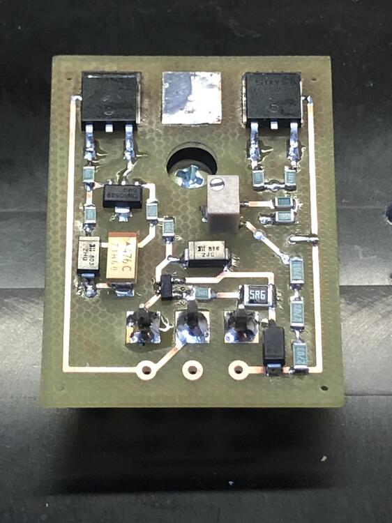 Today’s exercise. Milled a double sided board and populated it. Now I know it’s fairly easy to solder this by hand. If you can solder a mini T2 board the GRHVxxx boards shouldn’t be much of a problem. Besides it’s funny. This board is essential the same as Kerry’s except no enable and a trimmer to adjust output voltage. Thanks for those mini boards Kerry.