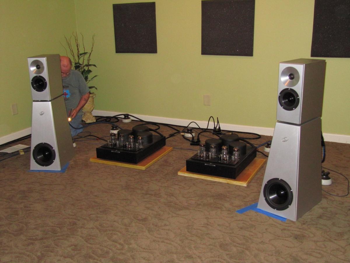 Carvers line arrays were very nice driven buy his new amps. Super clean, clear, and powerful sound, huge soundstage, lots detail, fast, listened a couple times for around 20-30 minutes each and never harsh. but big, better have ten foot ceilings. The YGA Anat ref. were a little big for the room, unless you got to be in the back row seats, then they were really good. Cleanest deepest, most detailed bass i heard from any room. The small Carmels in the same room were excellent. Best i have heard them and the only time I have heard them as good if not better than I get out of them in my room. makes me think about selling the Bat REX amp and getting one of the Krell evo 402e amps for mine, then selling my subs. Another big time eye opener for me was the new top of the line Soundsmith cartridge. WOW! it had zero weaknesses i could hear on two lengthy listening sessions.