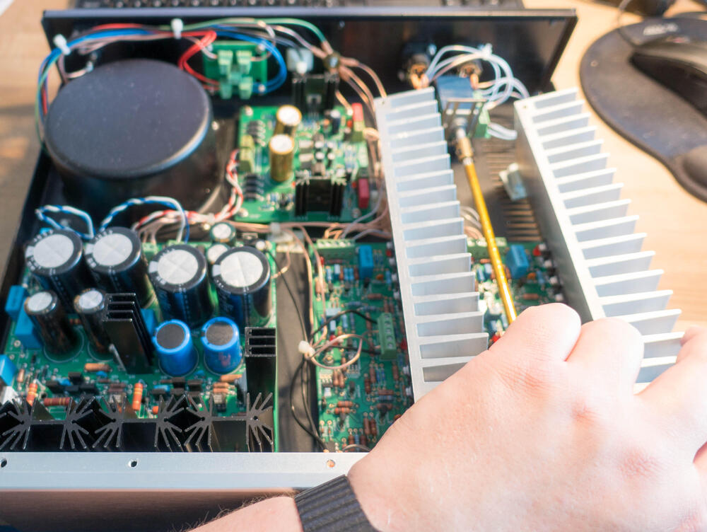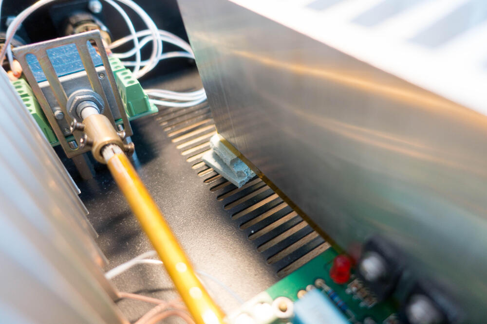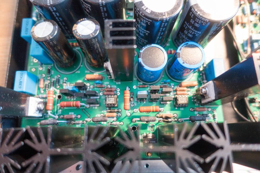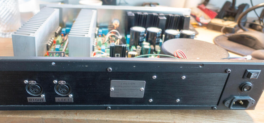 ...wait, there is more!! I woke up early so what better than strip this shit down. First off was to remove the transformer and I found this: Notice the wire coming off the IEC and into the end of the fuse holder...and another wire connected to that pad? Yeah... I don't see any evidence that there had ever been any solder on that end of the fuse holder and the insert which holds the fuse is indeed missing. That would explain why, when the PSU blew it left this mark on the chassis At least the IEC input is nice... Gotta have that gold plating. I also don't understand how anybody could put "copyright" on this PCB with a straight face: It's two traces between two terminal blocks... ok. Now the real price, lifting the amplifier boards: Notice the nice line of standoffs...yeah not connected to anything: The heatsinks just sat on them, not connected in any way. So this thing has been shipped and the only thing securing the sinks are the transistor legs!! Spoiler alert but what could possibly happen... So 3 screws hold the amplifier boards to the chassis but no lock washers anywhere and everything was loose. What a great way to support some of the heaviest objects in the amp.