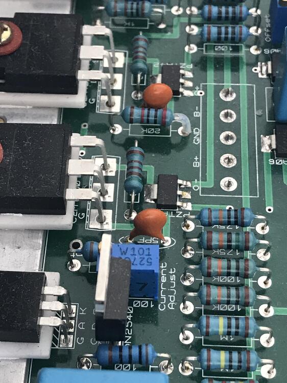 Thanks MLA. That was what I was thinking too. Then I don't understand why Simmconn was worried about exceeding the C2M1000170D's max Vgs rating? Here is an interesting thing - I went back to my PM's and could not find anything that discussed this mod to the 175K+175K bias resistor chain. However, I came across an early correspondent with Kevin about my plan to use 200K+150K instead (values I had on hand at the time). Now I wonder if the one that looks like a 100K may be in fact a 200K. It's hard to tell visually. I can desolder the resistor in question and measure it. But part of me, the lazy part, is thinking if all is well why not leave it along? Maybe between the +/- 406VDC rails and the 20mA bias current somehow puts the PZTA42 Vce in the desired region?