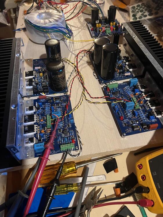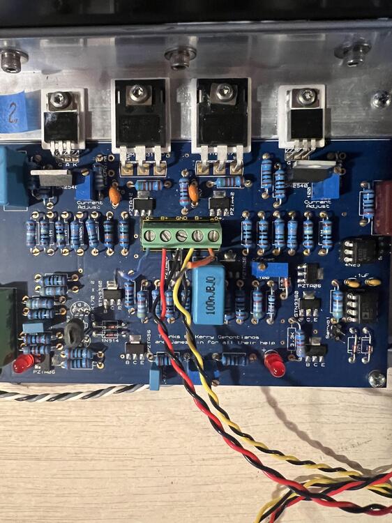 I did the mods per simmconn/mwl168 prescribed for 400V supplies, using a pair of 150K resistors replacing the pair of 174K. Offset seems quite stable (no servo), better than many dynamic amps I've built in terms of not bouncing around. I didn't recheck the bias. Channel 1: PZTA42 Vce: 13.5/13.6 Drop across 20K: 24.7 C2M Vgs: 3.37/3.25 Channel 2: PZTA42 Vce: 7.4/7.5 Drop across 20K: 24.7 C2M Vgs: 3.36/3.03 Amp was not warmed up, offset at ~10V per side and dropping. The channel 2 PZTA42 Vce was a little concerning. Let me know what you guys think.