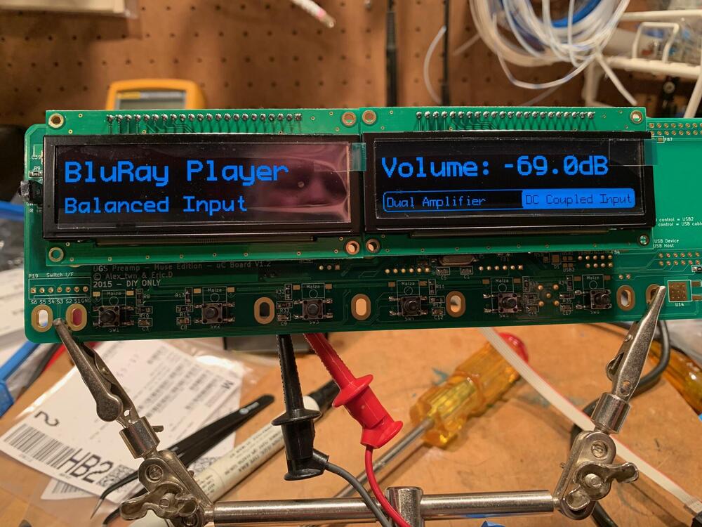 OLEDs in the house. UGS Muse preamp (x2). This one is for HC user DrizztDo (who I am building the Carbon for and previously built an SS Mini Dynalo for). The previous processor pic(s) were from my board (in the mini T2 build thread I believe). The 0.5mm 100 pin LQFP-100 package caused me to buy a USB microscope to see what the fuck I was doing... Jose had posted one in that thread.