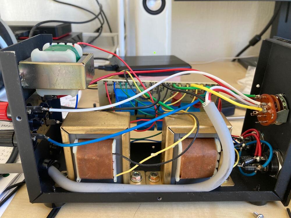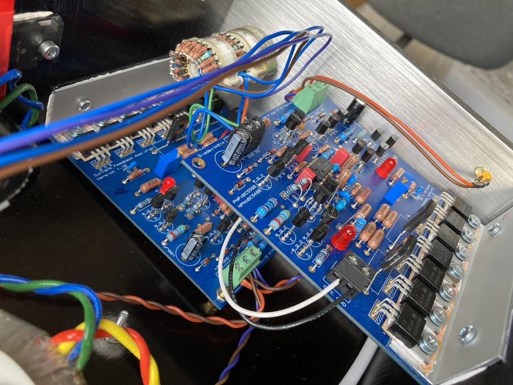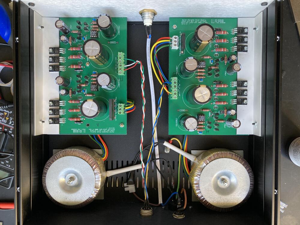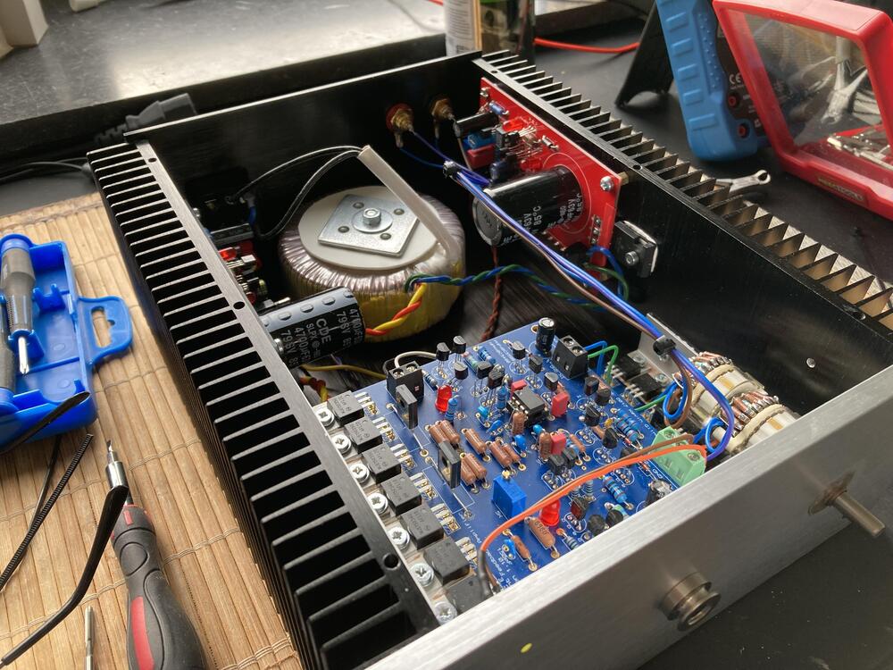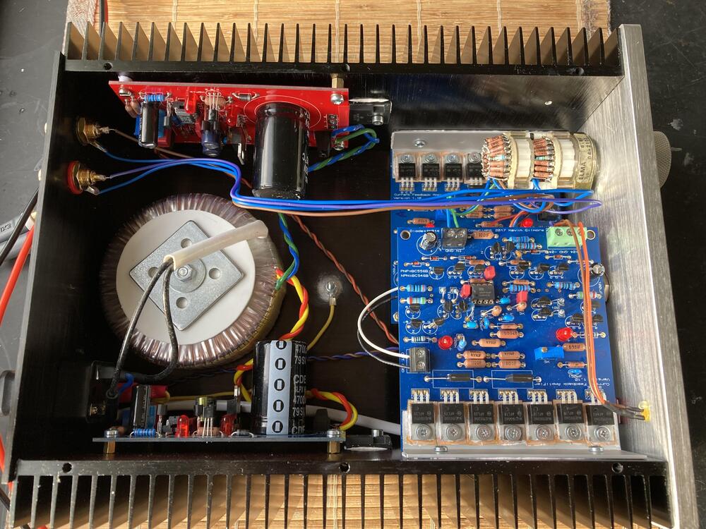 Finally completed my Dynahi, an on/off project (like some of them) for five years. Bought the set of boards from Samsie in December 2015, so I thought I'd just let him know that they eventually came of use! Turned out to be a relatively uncomplicated build, except for a couple of resistors around the THAT340 with too many zeros, discovered by MLA. Also a problem with the -30V side on one of the PSUs. Turned out to be a malfunctioning rectifier. A BC556 popped, but the supply worked once replaced. For a week or so, then the 556 popped again. After the third time I scratched my head, but some sparks from one of the surrounding caps told me it had taken some beating from the faulty rectifier. Replaced that and the DN2540 and now it has played without incidents for a couple of weeks. Sounds very nice and has become my go-to-amp, with some competition from a KSA5 I took over from MLA recently. Spoiled for choice.