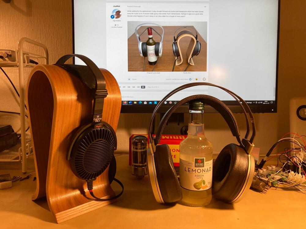 A listen now and then might be advantageous. Aren't the bottles supposed to be turned every year or so? About to replace the cable of the 007 when I've got the Carbon together. Gamma will do service meanwhile. Thinking of moving the drivers to a SR-X MkIII, but don't know if it's worth the effort. On-ear not so comfortable. If the Carbon fulfills expectations the headphone to the right behind may be the next step.