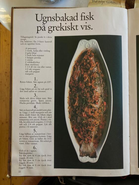 Plural form of "tomat", Swedish. Produce of Italy, one of the components used in this build of Greek extraction. Rub fish with juice of lemon. Cut onion in thin slices. Cut tomatoes in chunks, save the juice. Chop parsley, peel garlic. Fry onion for a few minutes, stir. Add tomatoes with juice, press garlic, add parsley, oregano, 1 1/2 teaspoon salt, 1/4 teaspoon pepper. Simmer for 10 minutes. Put half the tomato stir in casserole, put fish on top, add the rest of the tomato stir. Add wine. Bake in oven. I've used cod and salmon successfully, original recipe I guess calls for whatever the Mediterranean Sea brings.