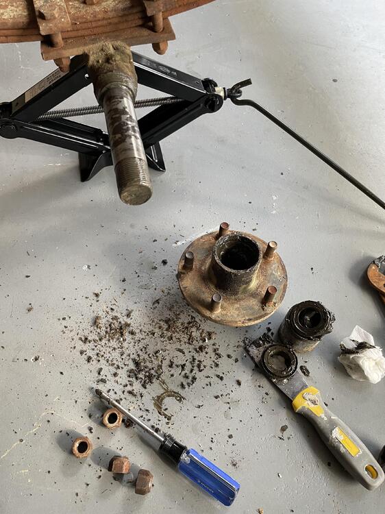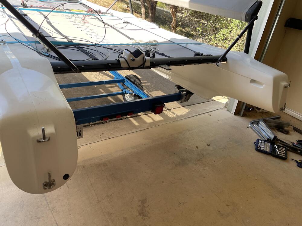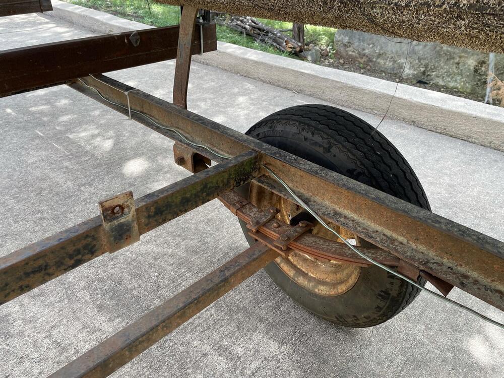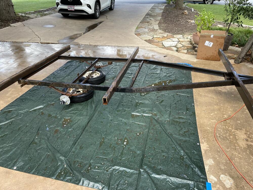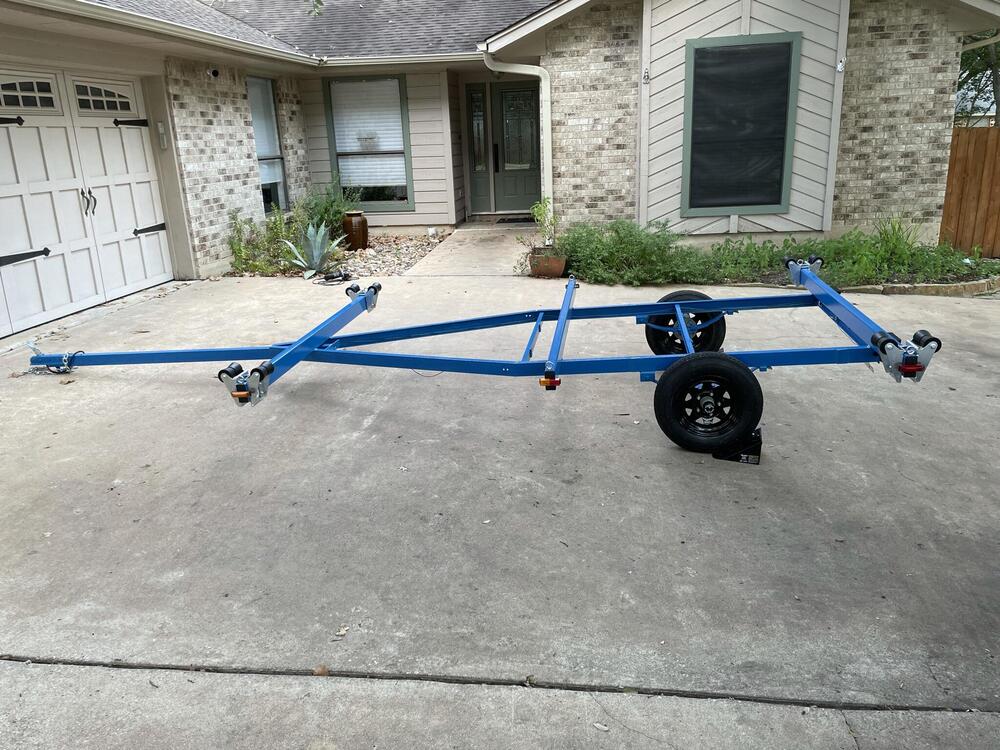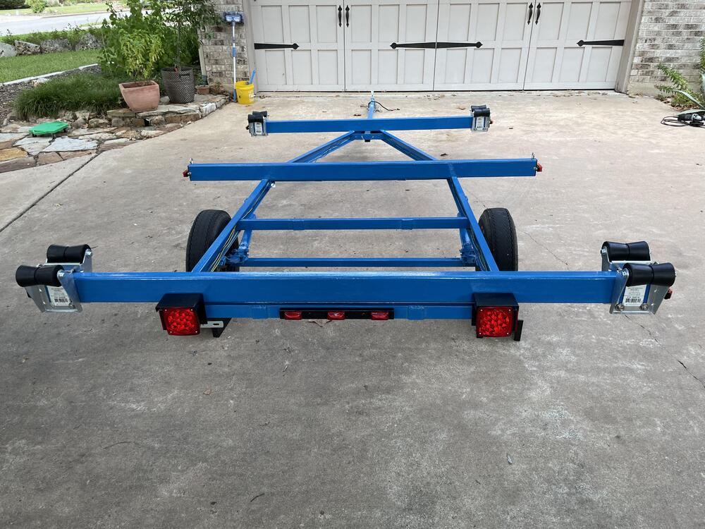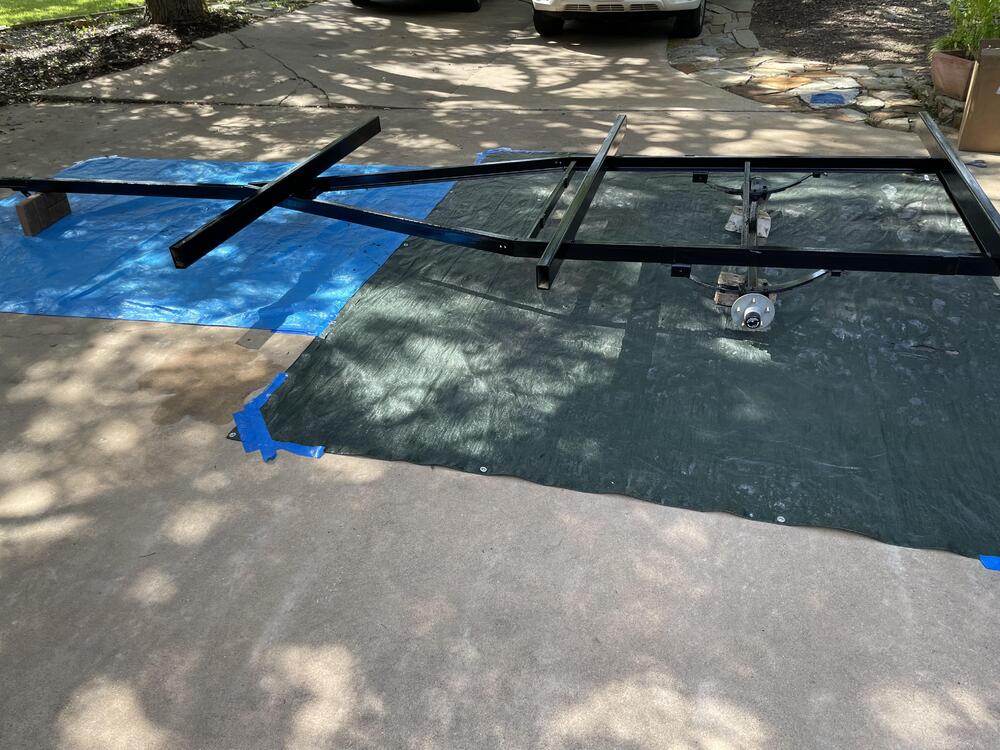 Been working to overhaul a trailer redid the bearings cut off the old bunks used POR-15 for three coats directly on the rust then top coated two coats of OSHA blue re-did all the wiring and lights to get it legal, finally got inspection and the vin number assigned (a three month process, involving appraisal, inspection, weight certificate, surety bond, tons of paperwork and waiting in lines…) Now I am on to working on the front mast cradle again and trying to build in a winch to help with the mast raising process. Had a trial run over the weekend and my trig was off (angles are hard) and line was too short. Rats!