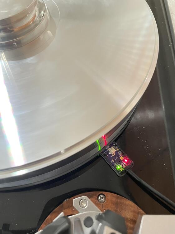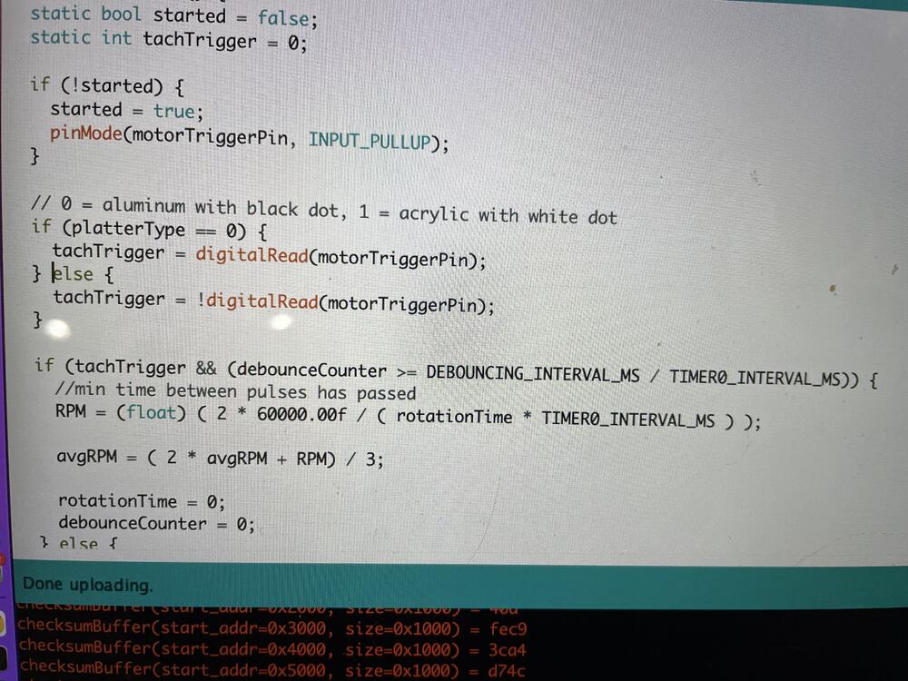 23. So, a bit of a stretch for this thread and I am doubting anyone will see the humor in this. But as y’all know o have been working in a tachometer feedback loop for my platter. With the lid off it looks like this: Previously I had an acrylic platter with a white dot that triggered the IR sensor each time it went around and used that to calculate the platter speed. Now I have an aluminum platter. To make it all work I had to add a black dot and update the code as follows. .. anyways I found this humorous.