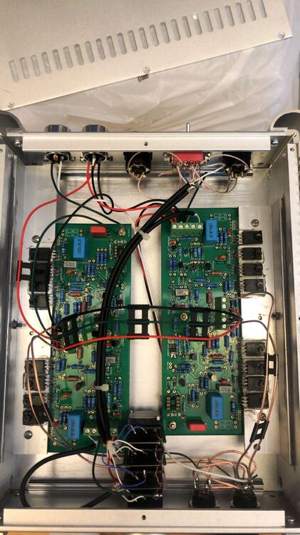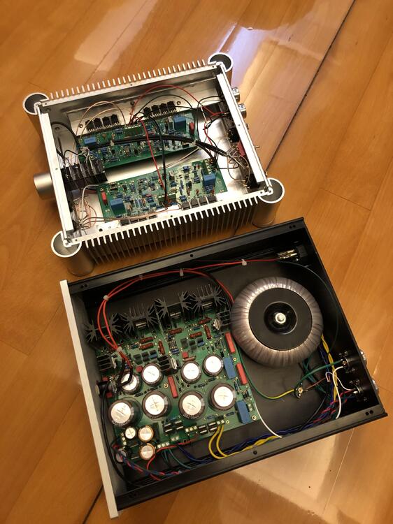 I managed to get my kgsshv project done without creating some big mess and spark, and I want to thank KG for his design , Birgir and many member here for their generous contributions. oyaide L/i50 OFC is used as umbilical cords but is not shown here. later on a L/R balance control will be installed. The power and the amplifying section is about the same size so they can be stacked together. The heat sink size is less than ideal and it runs so hot that I can barely touch. My IR thermometer reads 47 oc but I think it is inaccurate due to the shiny appearance of the heatsink. But then I think at least these heat sinks are bigger than those on-board ones so this should not be a problem. Two stax plug are installed becoz I have dozens of them taken apart from stax extension cords. There are some small issues during startup. The power supply board had some sparking on the bias section becoz some paint is off and probably there are some small filament peeled off from the leg of the 1n4007. It needs some epoxy to cover up the arcing spot. There is also something with the amp board. At first there is no sound, balance sits at 700v and two burnt 50k resistor on each board next to the stn9360. It turns out that I installed some mpsa06 instead. Luckily it fires up after replacement. The first second it plays it blows 717 away. Big soundstage , great dynamic and details. Pretty much no complain and is hard to beat except that vocal can be more engaging. Drives omega, es1a and 007 equally well. I think it somehow sounds sweeter than the carbon I built long thime ago.