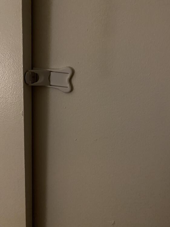 Problem solved. She immediately noticed that I removed the free weights and tape and then triumphantly attempted closet entry. Kitty disappointment was the result. I’m smart enough to have these at my shoulder level on affected closet doors: I think she could get the latches open if they were easily accessible. She’s a SMART cat.