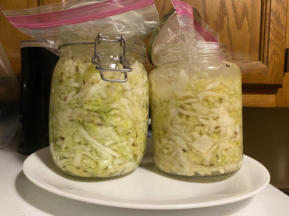 Not really “cooking,” but I’m fermenting for the first time in a while. Some sort of heritage cabbage Heather got from her local farmer’s market in North Carolina. I let it sit in my fridge, which was a mistake, as it lost moisture. I had a fix: I made a tea with bay leaves and added that, along with roasted fennel seed. I imagine it’ll be quite good.