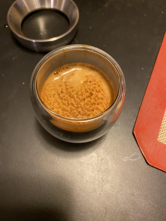 40 out in 45 seconds. Max 7 bar. Slow ramp down. VST basket. It’s… a nice cortado. First pic is shot, second is cortado with Bellman oat. No bitterness or sourness. Sweet lemon. Outrageously good. I honestly don’t think I could make a better cortado. Niche at almost (slightly finer than) 15 with the Counter Culture Apollo blend. Various normal puck preps thingies. I like this basket.