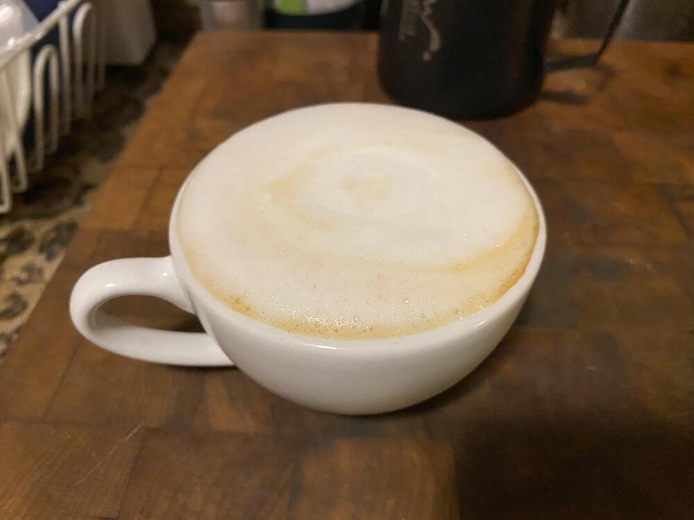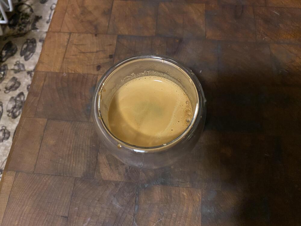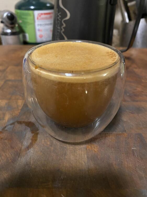 Coconut latte with Counter Culture Apollo. After doing oatmilk only the last few weeks, I had forgotten how coconut-y coconut milk is. 20 in, 40 out in 40 seconds (not including the inevitable pre-infusion with this). As nice a pull as you could want. I’m consistently getting a quick 7 bar peak and a slow, even drawn down at slightly finer than 15 on the Niche with this bean. I have the coffee bar workflow pretty well down, now: with dialed-in coffee (I took Covered_ears advice and am just doing one bean consistently right now), I can go from yawning to a latte in about 10 minutes. Most of that time is waiting for the Bellman to come to pressure. This isn’t anymore inconvenient then using the Breville, really, though that would allow me to pull two drinks simultaneously, so it’s not leaving the table.