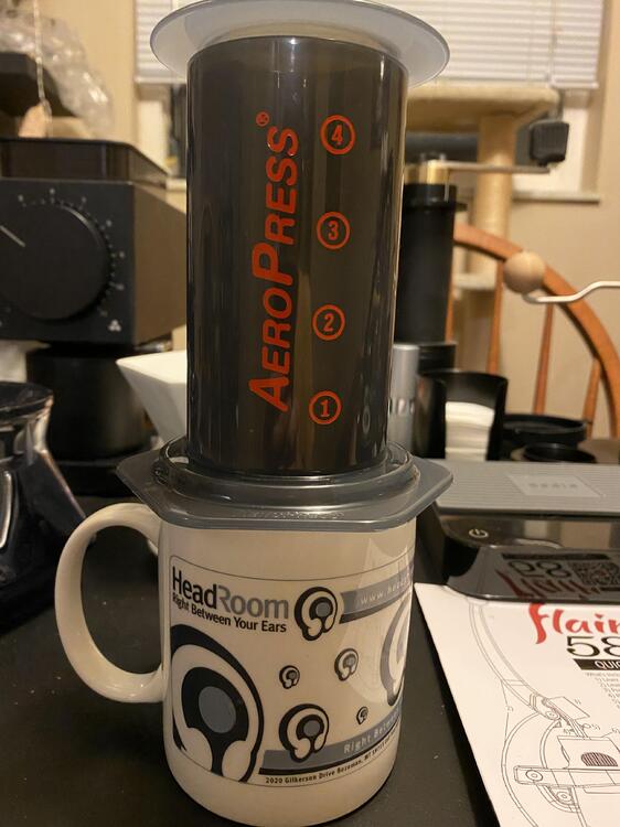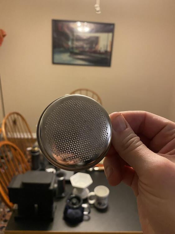4 was too fine. But it’s a perfectly nice cup of washed Finca Los Andes. Just the basic Hoffman recipe. I find his basic recipes to be good starting points. Precisely zero bitterness, though. Not really any stronger than my standard V60 method, I would say. Chocolatey, nice brightness (this was a medium-light roast, water was 210F). Coats the back of the tongue nicely. It was certainly easy. I can see why my old roommate stole it from me 15 years ago. 13.75/250 would probably fill the mug, and is what I would do next time, and at a 5 on the SSP multipurpose (I grind rather fine for pour over, and this really wanted something closer to my pour over than espresso, based on the puck being a bit wet).