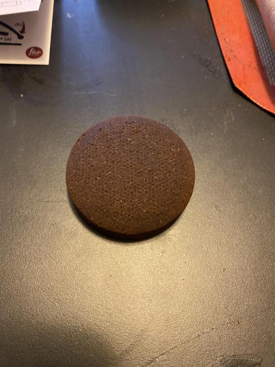First shot with the Flair 58 pulled. I didn’t grind fine enough (first use, after all!) and it pulled as a turbo, 18.5 in 40 out in about 18 seconds. I’ll go substantially finer next time. It was acceptable, though, especially as a latte. I’m still getting too large of bubbles with the Bellman, but I think I’m using too much pressure (the Bellman is much more aggressive a steamer than my Breville is, and I’ve only used it twice, so I’m not beating myself up over it). All in all, not too bad! Also not an ugly puck. Zero channeling evident on the top side (it broke when I tried to flip it over, so you’ll have to take my word for it). I really like the IMS basket.