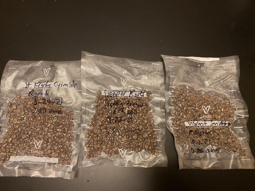 Travel packs: each 3.000 ounces (according to the Pearl 2021: yes, I chose individual beans at the end of that measurement, no I don’t think it’s 3.000 ounces. Pretty close to 3 ounces, though). I figure that is 4 cups/5 shots each bean with a bit of leeway. I’m traveling with a fair amount of coffee gear. The main reason (excuse) of why I have the Flair stuff and the hand grinders and why I bought my partner pour over stuff: to have coffee I’m willing to drink when I get to NC.