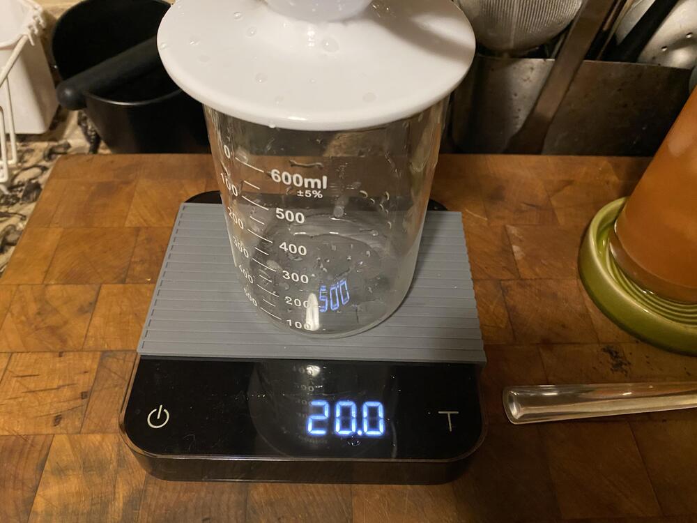 2. I put 20.01 grams of beans in the Option-O (I weigh beans on a different scale than I brew). This is what I got out. It will have to do. Yes I know I’m on the autism spectrum (morning juice mix on the side while I wait for things to warm up).
