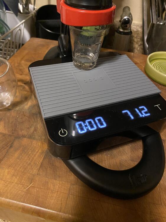 The Acaia Pearl is huge overkill for my needs, but it’s a nice piece of kit. I will, however, not be using it for espresso (at least not here). I had measured, and it technically “works,” but “that ain’t gonna work.” Fortunately I have this other little dingus, and I pull shots based on weight and flow, not time (I set a 25 second alarm on my phone just so I know I’ve hit what I sort of consider my minimum time with my rig). I’m really going to like it for pour over I think, though. That’s what I mostly drink anyway (coffee wise, anyway).
