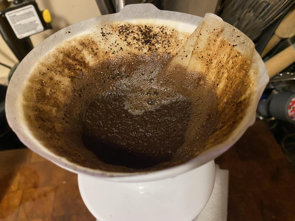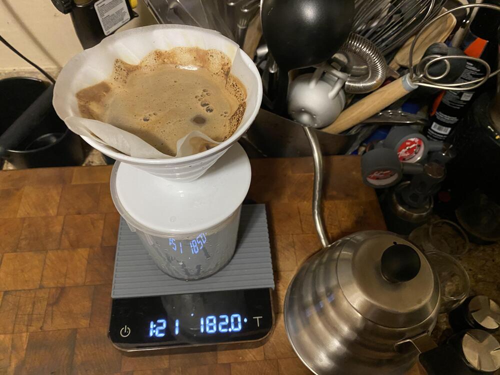 This isn’t entirely awful. Ground with a calibrated piece of shit (the good grinder is for espresso). I was going for 100 on the bloom (I don’t do quite anybody’s method, but I know this coffee)). Second pour and stir was at 200 to .01.