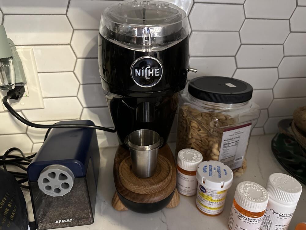 I’m at my partner’s for a couple weeks, so I travelled with the Niche and my little machine. Makes delicious espresso. I’m leaving the machine; Heather is interested in making espresso at home, in which case I should probably leave the Niche here and buy a Lagom P64, since I already have SSP multis in my Ode, which I could stick in the Option-O. The Niche and the little Breville fit in just fine in a busy kitchen.