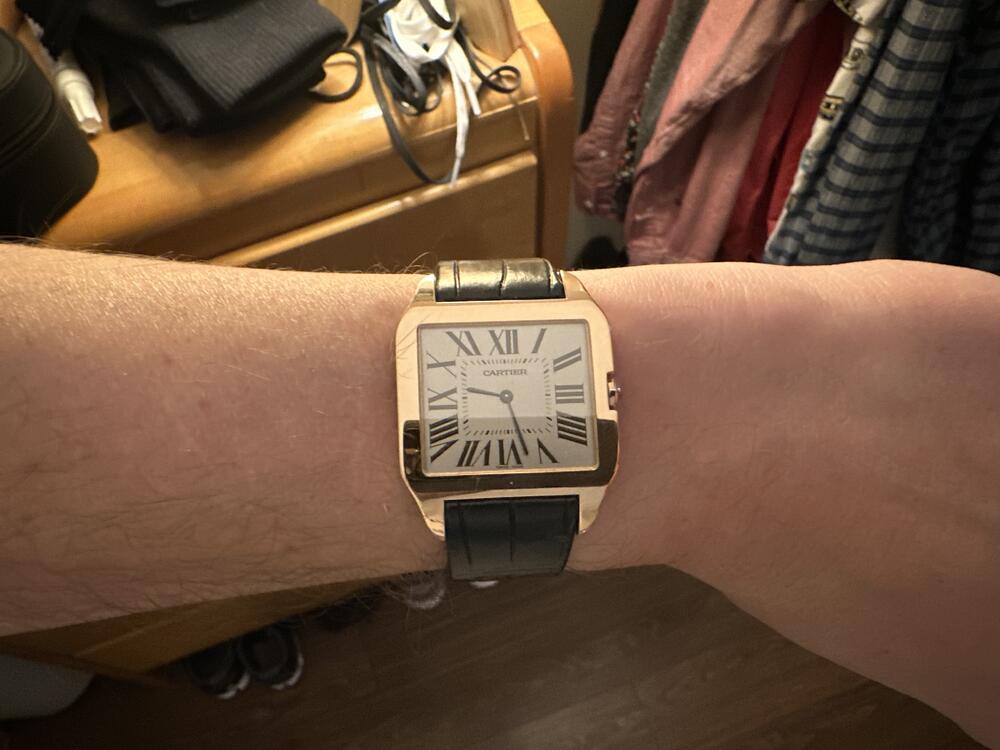 Well, the Slim D’Hermes will survive a shower. Forgot I was wearing it (very easy to do with this watch). No harm seems to have come to the strap, though the booklet is emphatic that it not get wet. The watch itself is fine; 3 ATM can handle a shower. Would it be sacrilege to find a really nice Milanese for this? I might even go swimming with it, then. I haven’t worn the Santos Dumont much. Not from a lack of desire to (I love it, and I’m reasonably certain I didn’t make a mistake by not getting a Bulgari octofinissimo in steel instead; I’ll maybe just get one of those in 2024: anyway, it wears like a dream), I just still haven’t put the first scratch on it yet, and I’m scared. What that tells me is I need more gold watches so that I can get used to scratching gold watches.