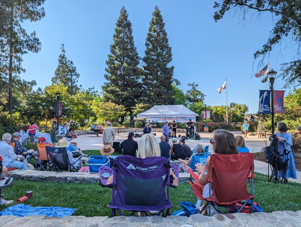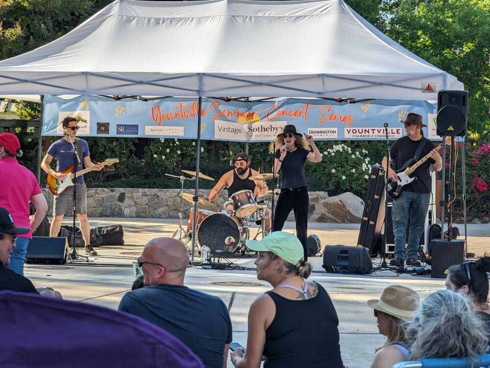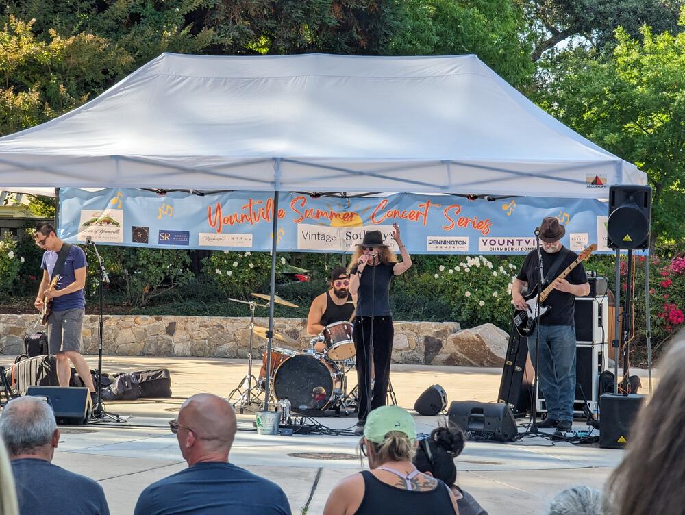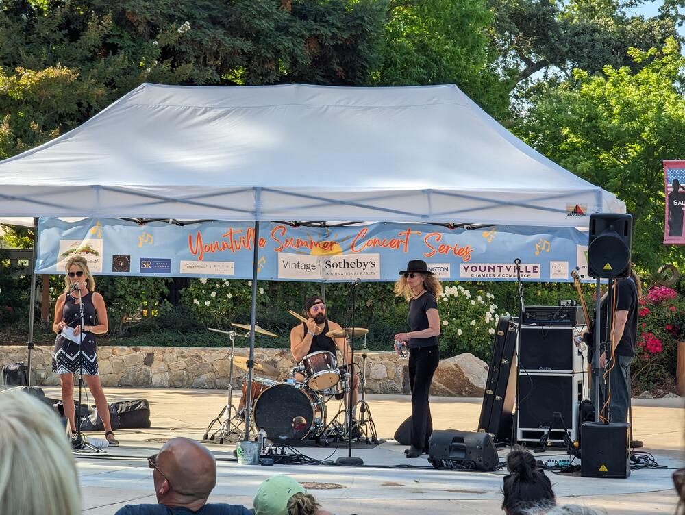 Good afternoon Yountville But first we'd like to thank our sponsors, Sotherby's International Realty, so don't forget to rush out and buy a house after the concert. Now some classic rock, with The Fog City Swampers (And the good people of Yountville) Who were also moved to dance by the end. .
