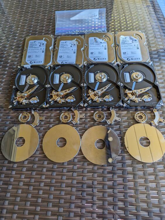 Disassembled some hard drives. Joanne's work had some old hard drives that they wanted to get rid of / render inoperable. With the right tool (torx screwdriver bit) it was relatively trivial to open them up and take them apart. All I need to do now is put the drive platters beyond use. However lacking a drill press, or a large calibre firearm and high speed camera, I'm open to suggestions. Thoughts?