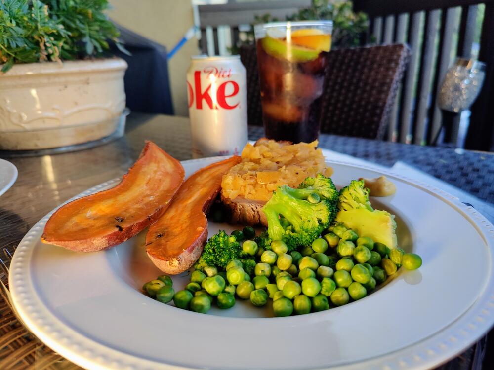 No-wait Deck Porky Goodness* *pork loin with home made apple "sauce", sweet potatoes, peas and broccoli