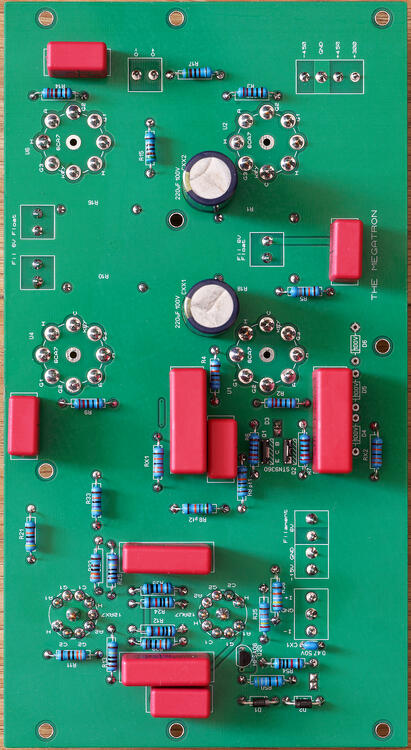 1. My megaslow build. Thank you JoaMat for supplying the 3 mosfets I needed for the golden reference psu. The megatron is workingish. This build was a little perplexing. I used groove tube 12ax7, electroharmonix 12au7 (gold pin) and groove tube el34s. I implemented the 12ax7 increased current modification form the outset. I found that I could only get about 220Vrms output before clipping. The clipping was not symmetrical and it was the bottom of the wave on the +O that was clipping only. I started to probe with a scope and found that the voltage drop at the 330K anode resistors on the 12ax7 was only about 19V on the +O side and about 35V on the -O side. Everything else looked fine. I scoped the output of the 12au7 when the amp was fine - no clipping when the output of the amp clipped. I checked all the psu voltages - no problems. It was the output of the 12ax7 was asymmetrically clipping. I took the valves out and measured them and the 12ax7 was only managing about 0.5mA output on one plate and about 0.8mA on the other. The avo manual said I should be expecting about 1.2mA. I was not sure if the amp had damaged the valve or if the valve was weak. So I checked the amp and removed the extra current modification and tried with a stronger 12ax7. Now both the +O and -O clip at approximately the same point but the clipping is still asymmetrical. I'm getting about 35V to 40V across the 330K anode resistors on the 12ax7. The bottom of both outputs clips before the top, and I am getting about 440Vrms output before clipping. I got in an email conversation with watford valves and the proprietor said that almost all new production 12ax7s are only capable of about 0.8mA and that only new old stock could do 1.2mA. So the high current mod might not be an option if you are running new production 12ax7s. I did some frequency response measurements and found the -3db point was only at about 23-24Khz... which seems rather low. Could someone tell me what output voltage rms they are getting before clipping and the -3db point for verification. thanks in advance James
