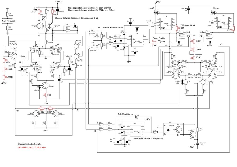 My mini T2 amp boards. Note the screw terminals on the top to make troubleshooting easier I know JoaMat does not believe in screw terminals but I do. 😉. If you are careful its even possible to orientate the terminals so the silkscreen voltage markings are still visible 🙂 . I take a 2 terminal and cut it in half and put the original smooth side parallel to the silkscreen markings. There is not space for screw terminals for the heaters of the el34s so I (possibly temporarily) have soldered in a header pin at 45 dgrees I have used nylon m3 standoffs for the first layer so that there is no chance of the standoff shorting against anything and brass standoffs for the remaining layers to get to the required height. SMD soldering was done in a three step process. 1 apply solder paste to the pads. 2. melt the solder using a hakko 888D station at 330 degree C using a fine tip until the paste has migrated to only be on the pads. 3 Hold the component with twisers onto the pads and with my other hand use a Quick 861DA hot air station using the smallest supplied nozzle with airflow setting all the way down to 5 (even then its possible to send one of the small diodes into orbit with that air flow)... to reflow the solder onto the component. the reason I soldered this way was, 1. I could collect any excess solder with the hakko, since I dont have an electronic solder paste dispenser... 😞 2. I could be reasonably certain there was no solder paste left under a component. I use the same method for soldering Kevins' synchronous rectifiers. this is the schematic of the v0.2 pcb with valves from the silkscreen. The red components have changed since the last published schematic.