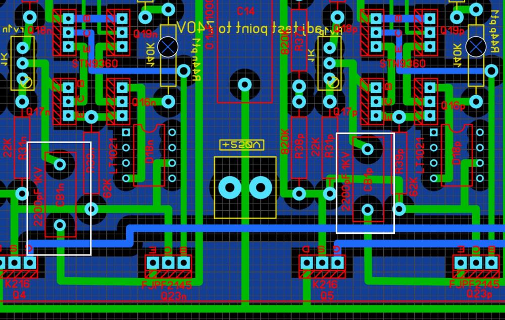 I would not want to speak for Joamat, but the impression I got was that the mini T2 was an attempt to simplify the complex design and make it as small as possible by going surface mount whenever possible. Ther is not a lot of space around Q17n but I think a 13mm by 4mm 1KV 2200pF (10mm lead spacing) film cap like a wima MKP1O112203C00JSSD will fit and there are film caps of the same size and rating ranging from 1000pF to 6800pF. The area around Q17p is more problematic due to an extra track which results in one tracking having to be rerouted. Channel 1: channel 2: