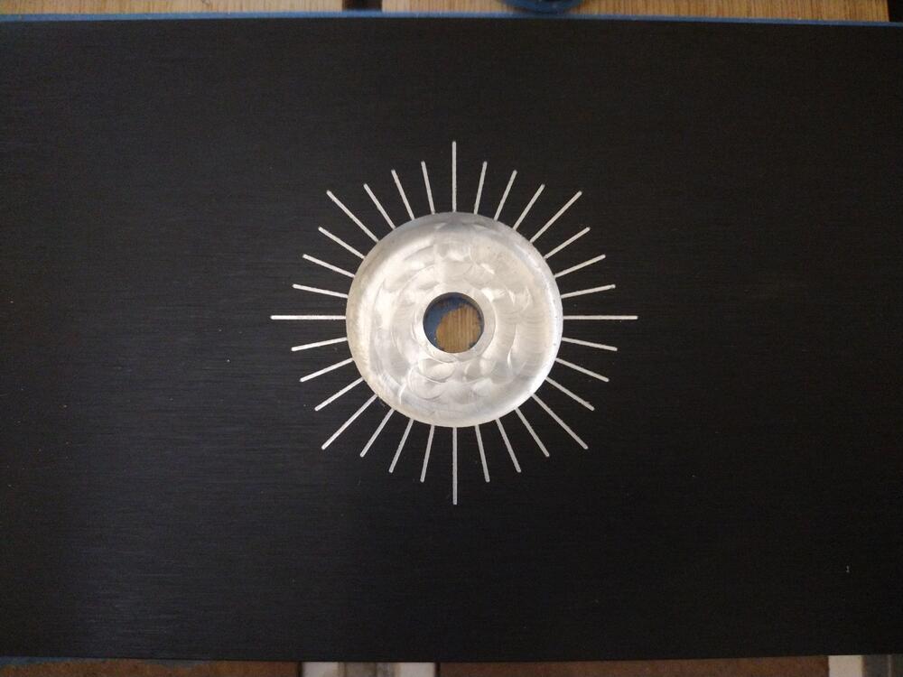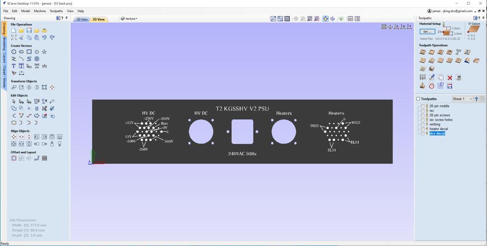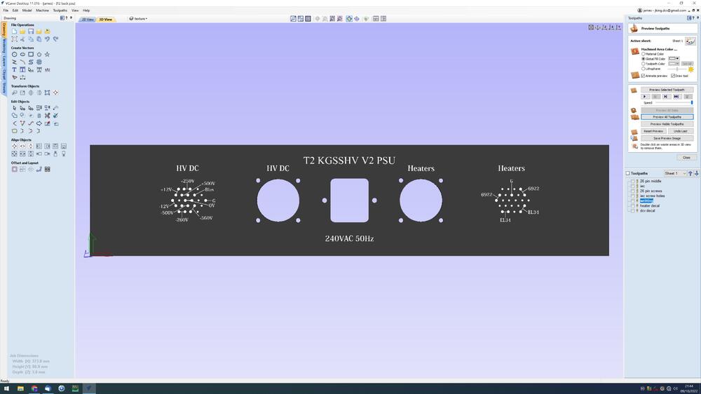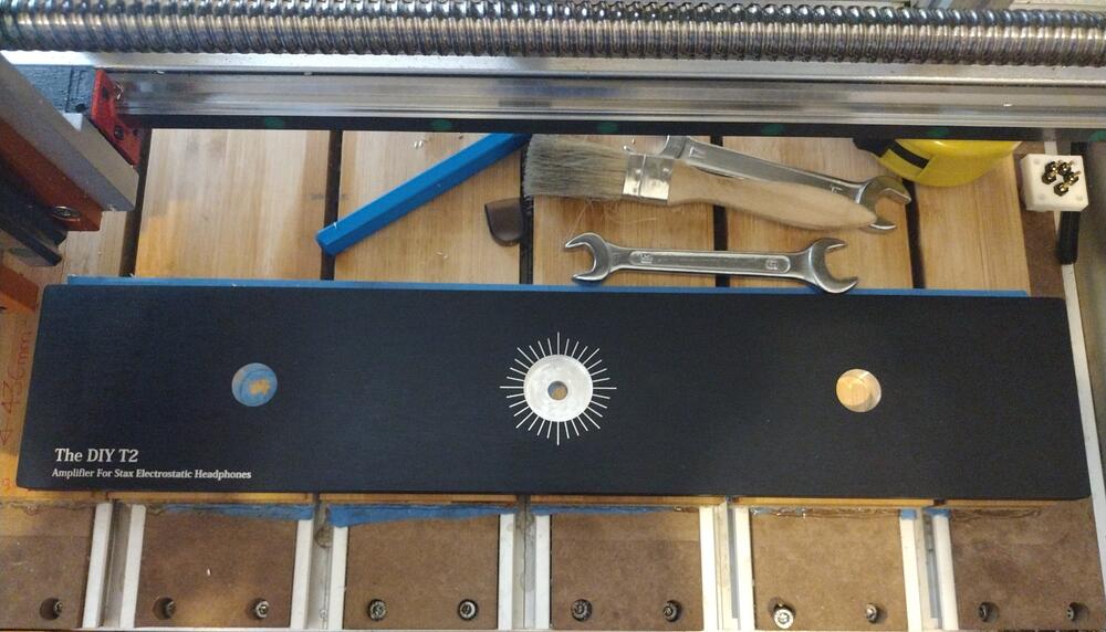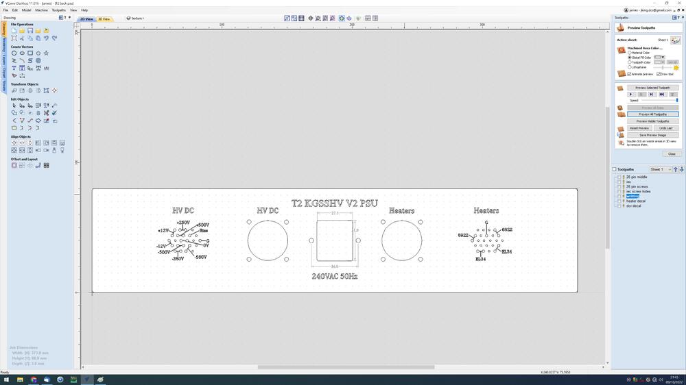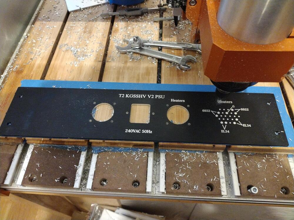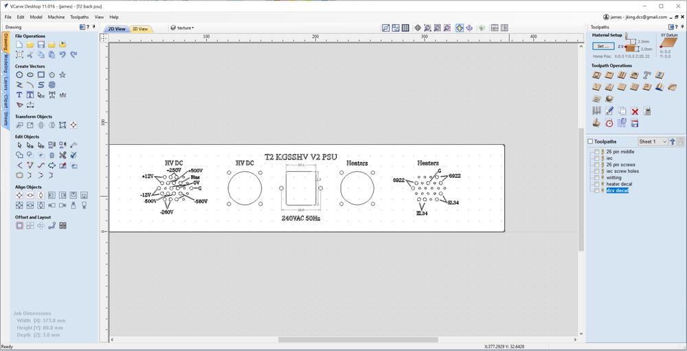 T2 psu back panel, design and cut. I wanted to have the pin outs of the sockets for the umbilical chords from the psu to amp to be on the psu back for future reference.. I decided to go for 10degree 0.1mm tip engraving bit for the lettering, 0.025mm depth of cut rather than laser. Screw holes done with 3.175 end mill and main cut outs 6mm end mill. Now I have a good collection of quality bits and little experience now. CNC machining is starting to become FUN 🙂. Its so much nicer and more satisfying watching a CNC cut than using a hand drill and Dremel... Tool changing is a bit of a hassle and then I have to use a Z block and Z probe command get the new Z height reference for the tool sickout. So I try to minimise the number of different tools used. Tape hold-down and CA glue works perfectly. I'm very happy with the surface finish, perhaps the text for the pinouts and lines could be a little narrower, but its certainly not a disaster. Cut still currently in progress: The nice thing about symmetrical panels is that you can always adjust your settings and have another go with the other side... I decided to decrease the line width by half, nock 20% off the size of the socket decals, decrease the socket decal font size, change the style of the lines and reduce the engraving depth from 0.025 to 0.02mm... I think the new version should look a little less blocky and a bit more refined... The 0.02mm engraving depth is slightly too little, other than that I think its an improvement. -