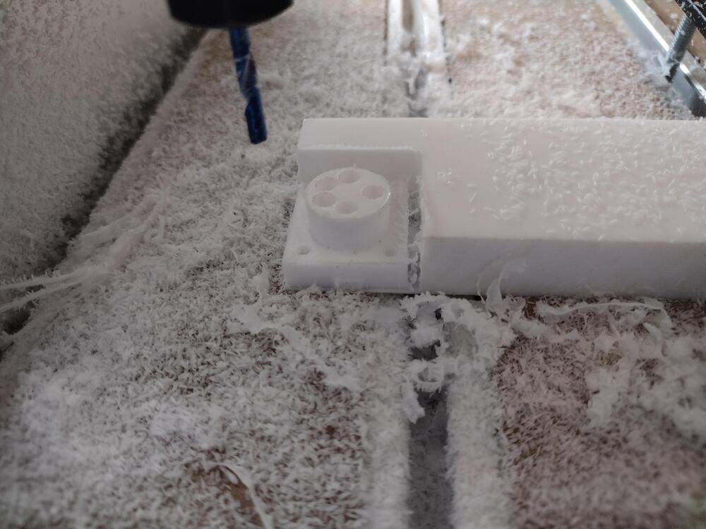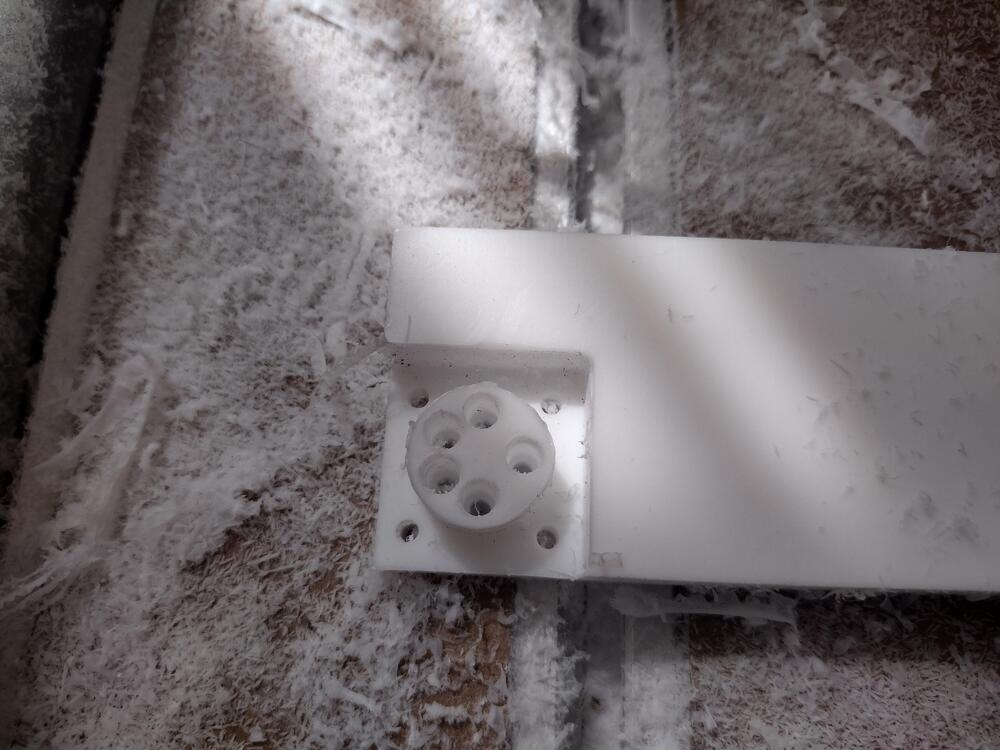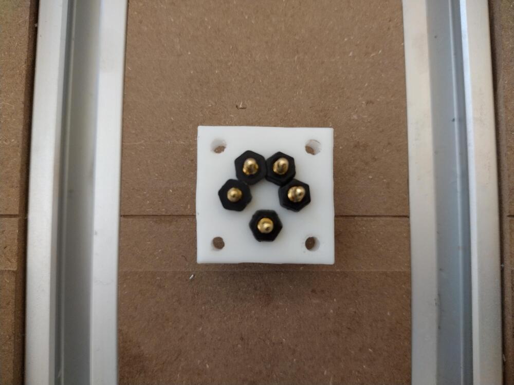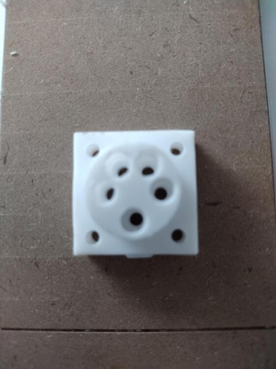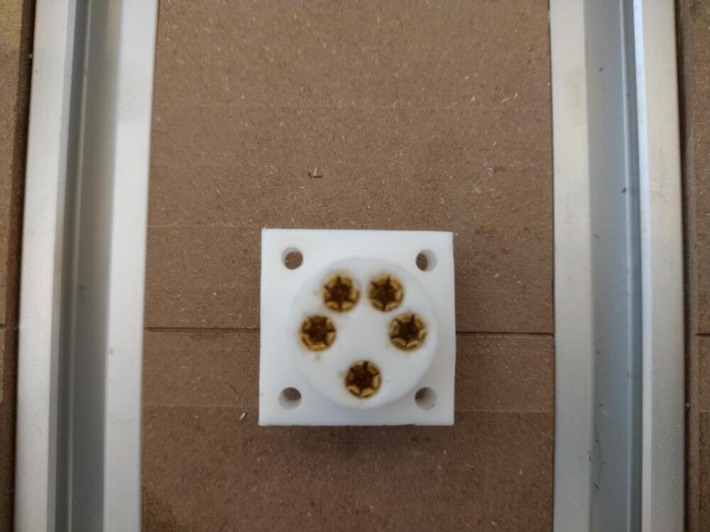 I got bored waiting for the replacement bolts to arrive and so purchased my own and finished installing the missing bolts. Here is my first CNC project: Making my own Stax 5 pin sockets using ptfe design in vectric vcarve desktop: making some (ptfe) chips and no router bits broken... final result after deburring and running the drill holes all the way through: overall I am happy with the result. The tabs holding the piece into the material could have been smaller and after test fitting the pins the holes should have been 4.6mm rather than 4.5mm but I don't have a 4.6mm drill yet. other than that I have a working Stax socket 🙂 This first version uses 3 tools: 3.175mm end mill, 3mm drill and 4.5mm drill.... its slow and boring changing tools, so I remade the tool paths only using a 3.175mm end mill, ran the code and found the drill holes were smaller than expected. I measured the 3.175mm end mill... 3.13mm... hmm... so I updated the tool data base with the correct diameter and re-ran the cut again.... I realise now I have to measure all my tools and not rely on the size they claim. I could not find any metal m3 nuts that fit the threads but are small enough not to touch each other so I used nylon nuts instead. I tested the insulation between the closest pins pairs to each other and got 300Gohm at 5.5Kv. -